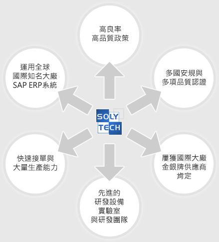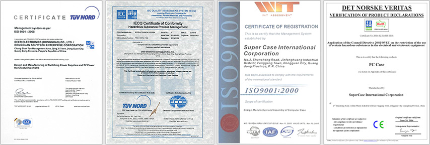 產品通過多國安規與多項品質認證,客戶端之品質不良率< 200 DPPM。本公司產品在研發過程中,皆以精密的儀器不斷校正,使產品品質臻至完美。產品通過認證如 TUV、UL、CSA、NEMKO、FIMKO、DEMKO、SEMKO、CE 等國際安規認證。在零件的使用上也以通過國際安規認證之優良零件為使用標準,並對供應商採取品質評等作法,使供應商之產品標準維持一定,此舉更能確保產品之穩定性與安全性