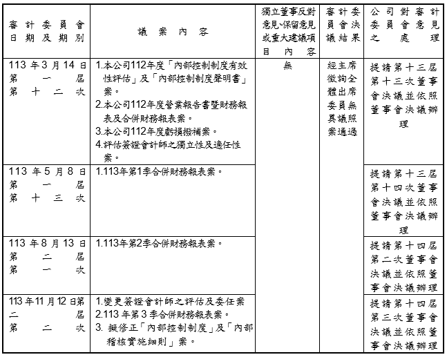 本公司審計委員會於113年度舉行4次會議,審議事項主要包括以下: