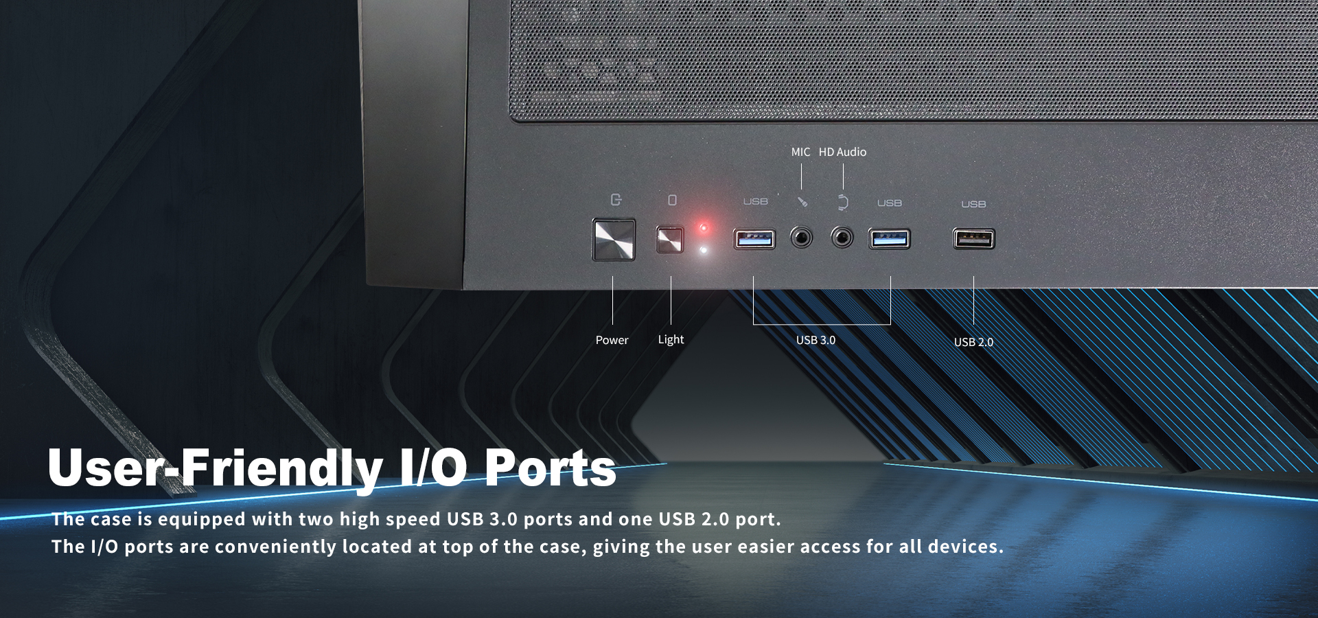 Front I/O: USB 3.0 x 2, USB 2.0 x 1, Audio In & Out (supports HD Audio)